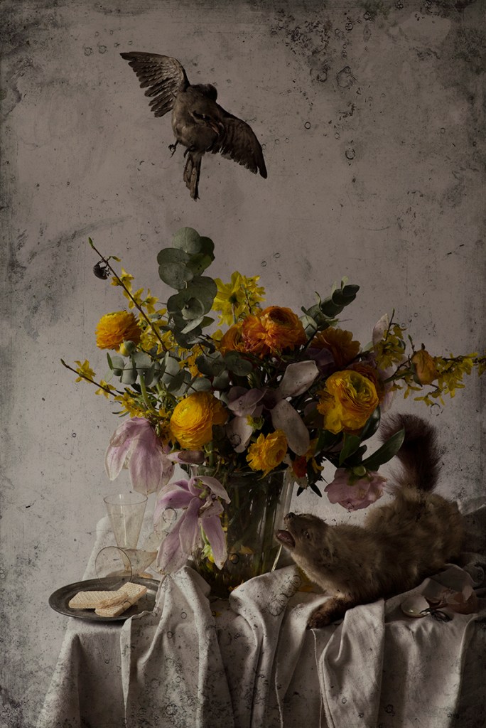 🖼️ Fables, série de natures mortes. Technique mixte : Travail à partir de prises de vues et plaques albuminées . Impression encres pigmentées sur papier coton Hahnemuhle . Formats 100×70 cm.
