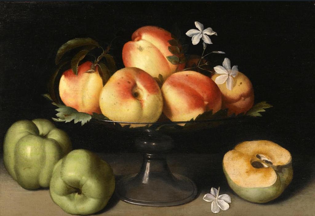 🖼️ Coupe de fruits en cristal avec pêches, coings et fleurs de jasmin, vers 1610, huile sur toile, 31 x 43 cm. Collection privée.
