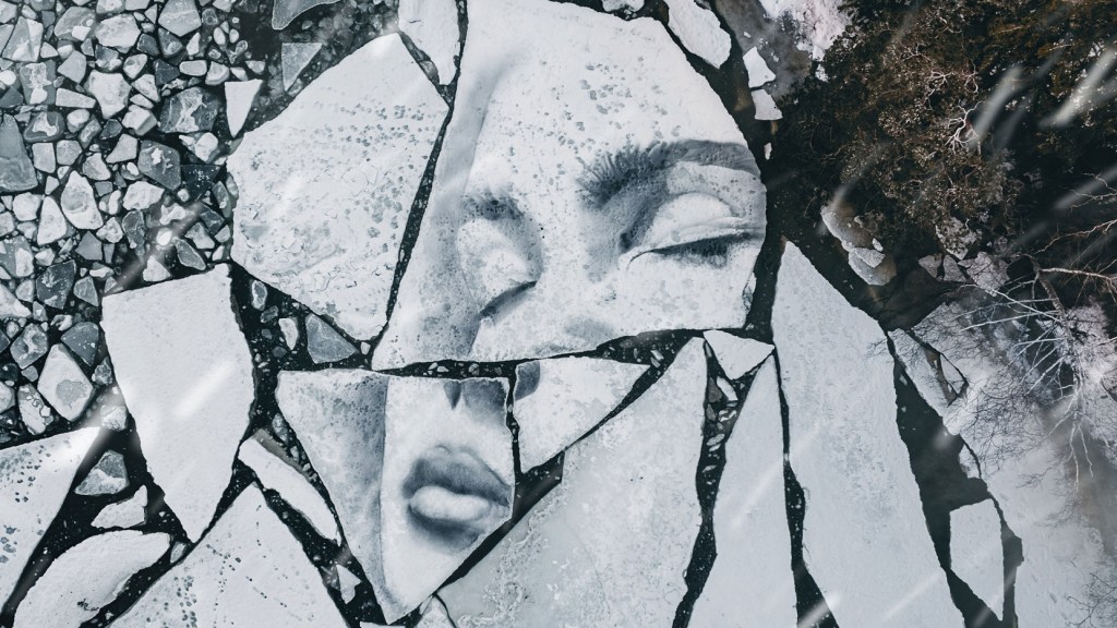 👨🎨 L’artiste américain David Popa et son œuvre « Fractured« , des portraits qu’il « peint » sur des blocs de glace dans le sud de la Finlande.